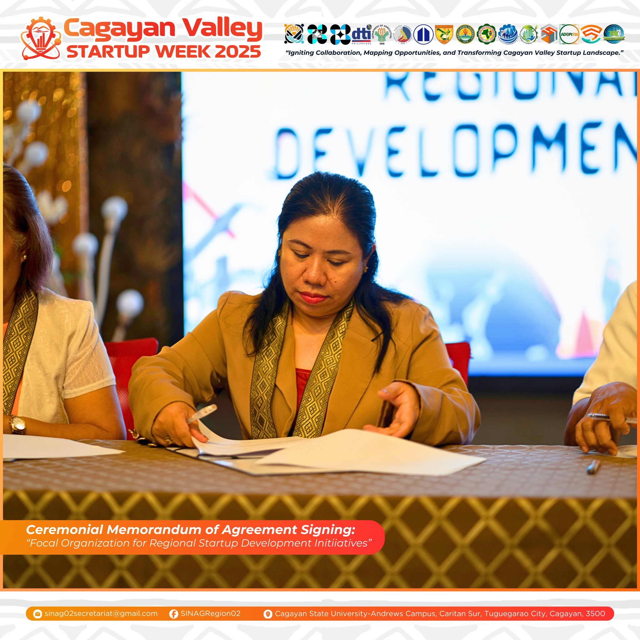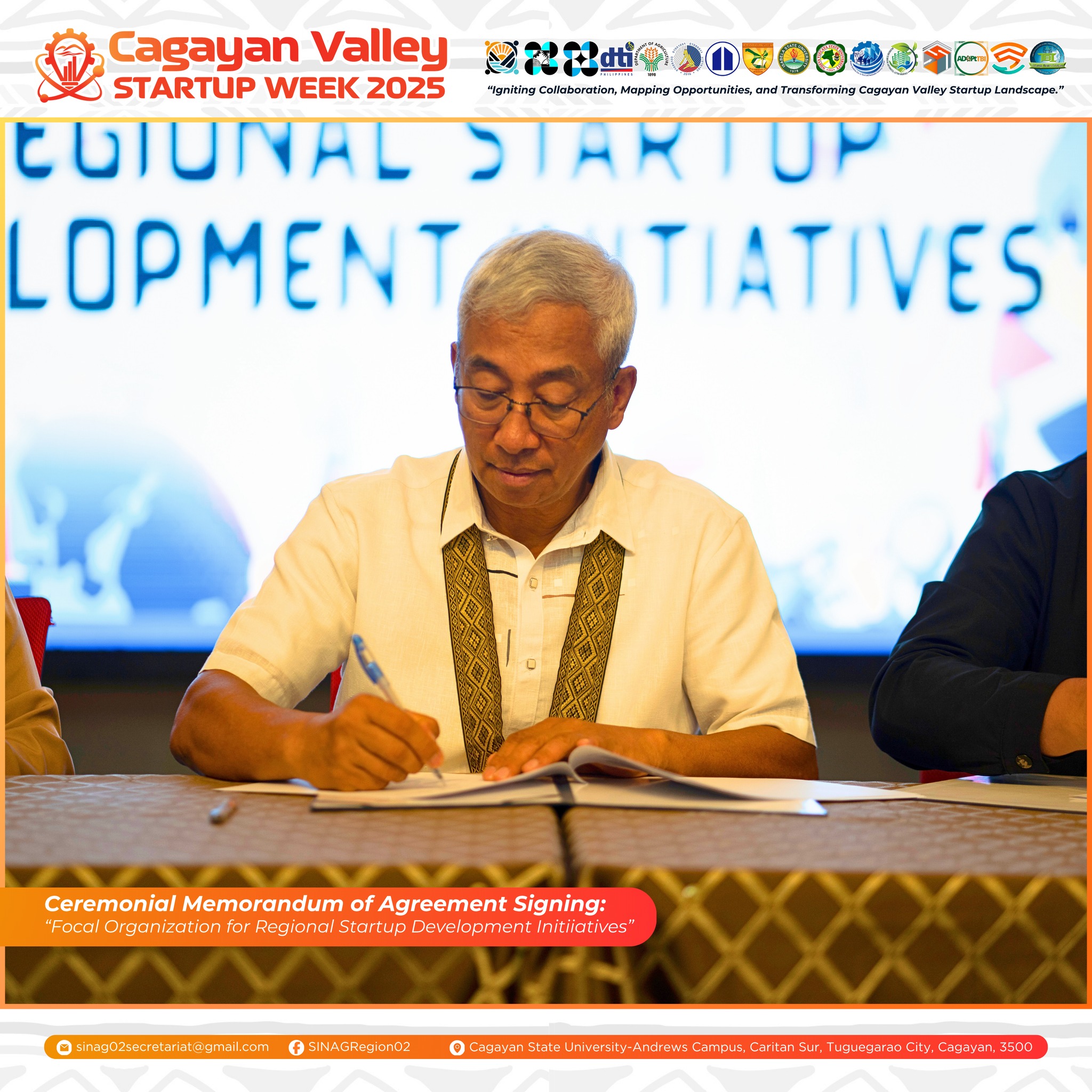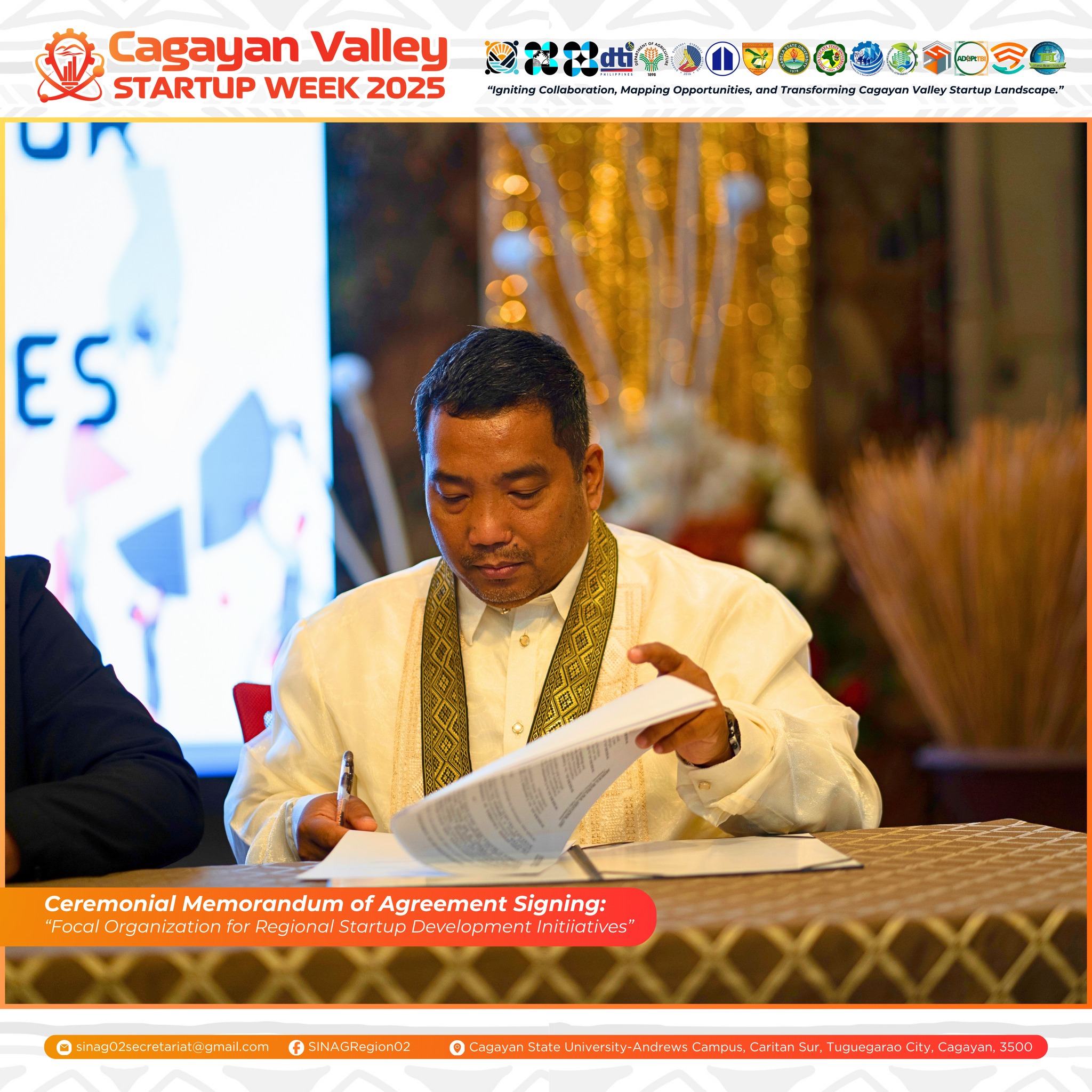 A significant milestone in regional innovation was marked during the Cagayan Valley Startup Week 2025 with the 𝑪𝒆𝒓𝒆𝒎𝒐𝒏𝒊𝒂𝒍 𝑴𝒆𝒎𝒐𝒓𝒂𝒏𝒅𝒖𝒎 𝒐𝒇 𝑨𝒈𝒓𝒆𝒆𝒎𝒆𝒏𝒕 (𝑴𝑶𝑨) 𝑺𝒊𝒈𝒏𝒊𝒏𝒈 𝒃𝒆𝒕𝒘𝒆𝒆𝒏 𝒕𝒉𝒆 𝑺𝑰𝑵𝑨𝑮 𝑪𝒂𝒈𝒂𝒚𝒂𝒏 𝑽𝒂𝒍𝒍𝒆𝒚 𝑪𝒐𝒏𝒔𝒐𝒓𝒕𝒊𝒖𝒎 𝒂𝒏𝒅 𝒕𝒉𝒆 𝑷𝒉𝒊𝒍𝒊𝒑𝒑𝒊𝒏𝒆 𝑪𝒉𝒂𝒎𝒃𝒆𝒓 𝒐𝒇 𝑪𝒐𝒎𝒎𝒆𝒓𝒄𝒆 𝒂𝒏𝒅 𝑰𝒏𝒅𝒖𝒔𝒕𝒓𝒚 (𝑷𝑪𝑪𝑰) – 𝑪𝒂𝒈𝒂𝒚𝒂𝒏 𝑪𝒉𝒂𝒑𝒕𝒆𝒓. This historic agreement formally designates PCCI–Cagayan Chapter as the “𝐹𝑜𝑐𝑎𝑙 𝑂𝑟𝑔𝑎𝑛𝑖𝑧𝑎𝑡𝑖𝑜𝑛 𝑓𝑜𝑟 𝑅𝑒𝑔𝑖𝑜𝑛𝑎𝑙 𝑆𝑡𝑎𝑟𝑡𝑢𝑝 𝐷𝑒𝑣𝑒𝑙𝑜𝑝𝑚𝑒𝑛𝑡 𝐼𝑛𝑖𝑡𝑖𝑎𝑡𝑖𝑣𝑒𝑠,” signifying a strengthened collaboration between the academic and private sectors in advancing the Cagayan Valley’s startup ecosystem.